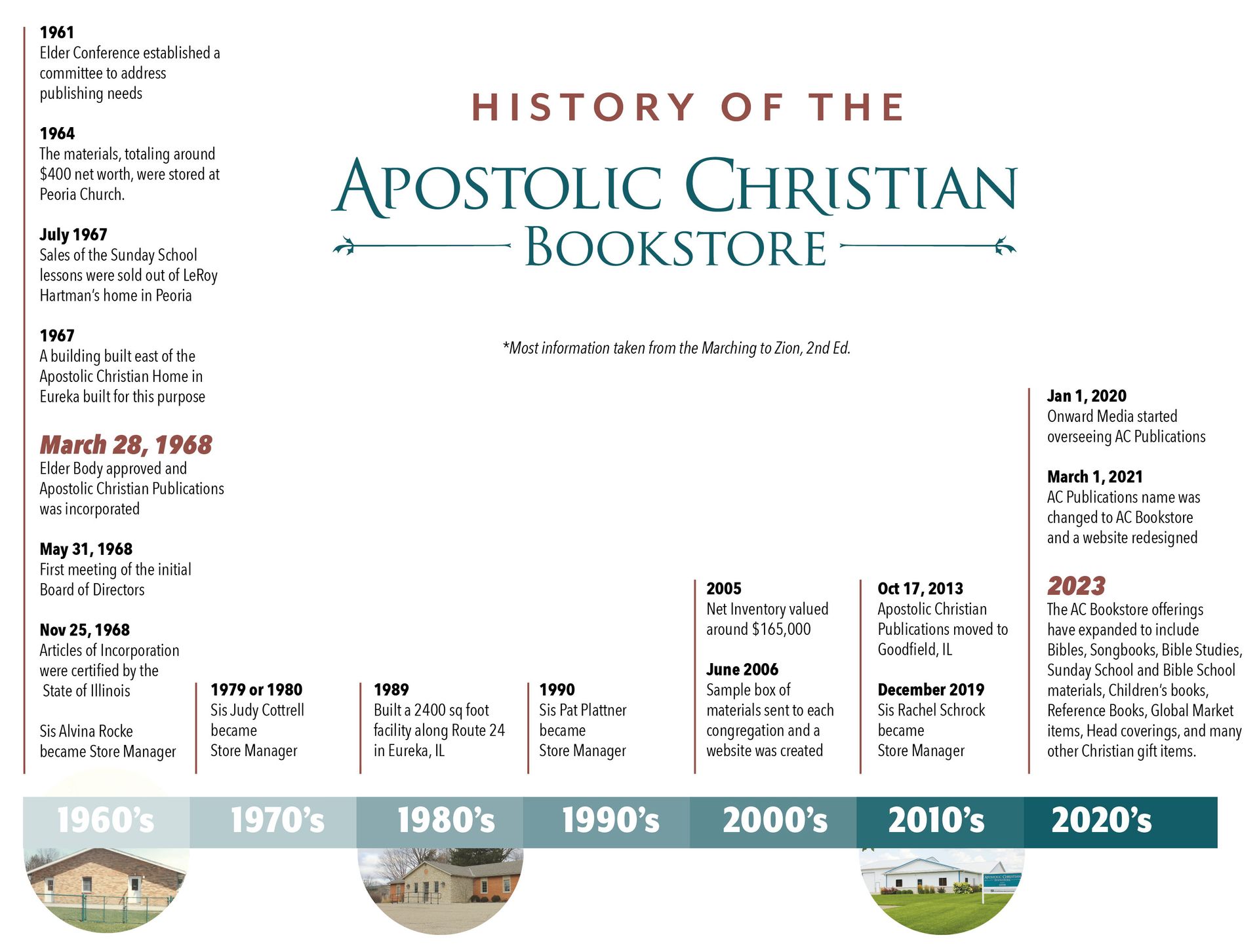 The governance for the Apostolic Christian Bookstore is provided by Onward Media, a new entity resulting from an elder body-directed reorganization of Apostolic Christian communications groups.